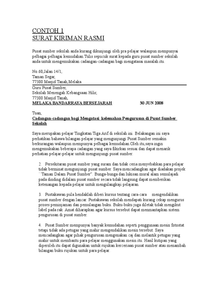 Untuk menulis surat berbentuk penulisan surat kiriman ini anda perlu mengikut teknik penulisan yang betul seperti berikut -. Berikut adalah salah satu contoh surat rasmi pemberitahuan kerana tidak dapat menghadirkan diri untuk bertugas tanpa sijil sakit ataupun untuk dikepilkan sekali bersama sijil sakit. Dibawah perenggan ini adalah contoh surat rasmi rayuan bagi permohonan ke mrsm.
